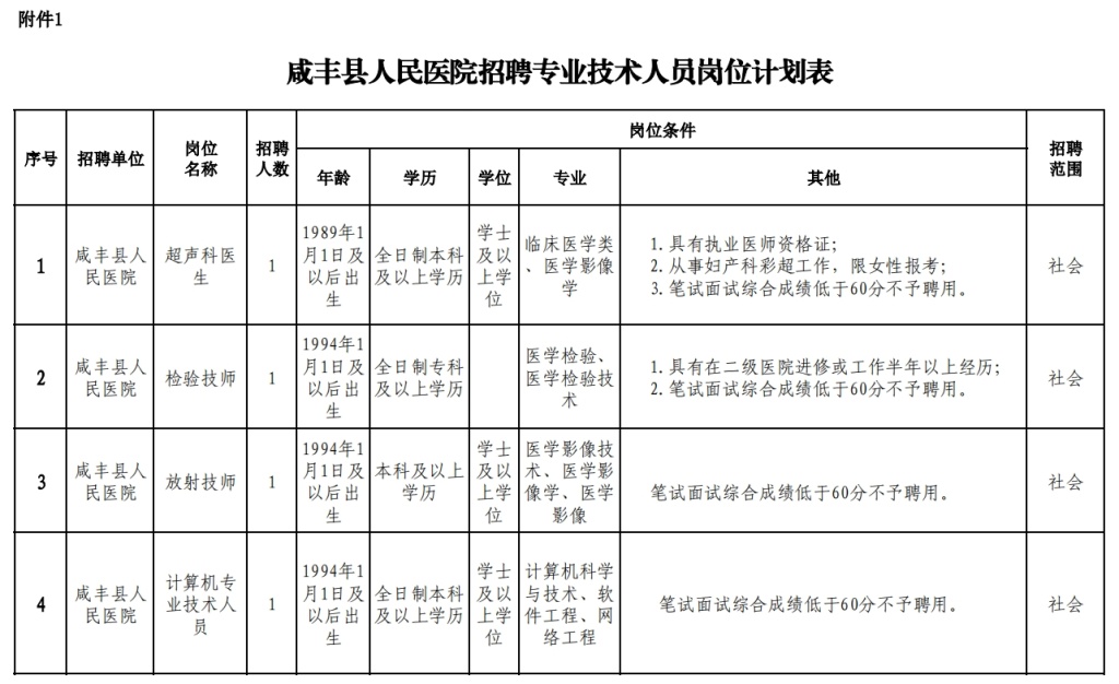 见附件:《咸丰县人民医院自主招聘专业技术人员岗位计划表》。